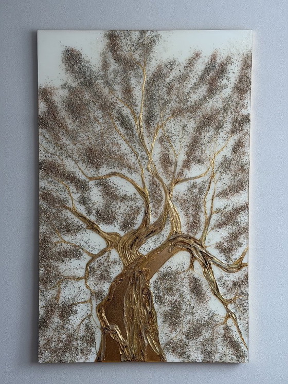 Dieses beeindruckende 3D-Wandbild zeigt einen blühenden Baum, der Leben, Stärke und Wachstum symbolisiert. Das Kunstwerk besticht durch seine reichhaltigen Texturen und strahlenden Materialien und wird auf einer stabilen MDF-Platte mit folgenden Materialien gefertigt: