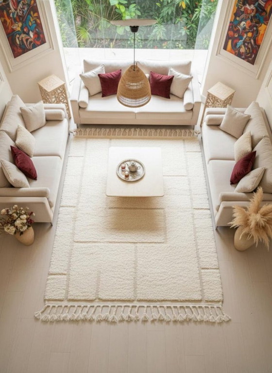 Entdecken Sie diesen einzigartigen, handgefertigten Teppich aus dem Herzen von Midelt, Marokko. Gefertigt aus dicker, weicher Naturwolle, bietet er außergewöhnlichen Komfort für jeden Tag und warme Farbtöne wie Lehm, Steingrau, Elfenbein und Bernstein für ein modernes und beruhigendes Ambiente. Seine geometrischen Muster, inspiriert von traditioneller Berberkunst, machen ihn zu einem authentischen und originellen Stück, perfekt für Wohnzimmer, Schlafzimmer, Büro oder Leseecke. Kombinieren Sie ihn mit Möbeln aus Rohholz, Leinen-Vorhängen oder gewebten Accessoires für einen natürlichen und gemütlichen Stil. Jeder Teppich wird von erfahrenen Kunsthandwerkern in sorgfältiger Handarbeit gewebt – ein Handwerk, das seit Jahrhunderten weitergegeben wird – und die Fertigstellung kann bis zu 15 Tage dauern. Erhältlich in verschiedenen Stilen (Beni Ouarain, Azilal, Mrirt, Boujaad, Midelt, Khenifra).