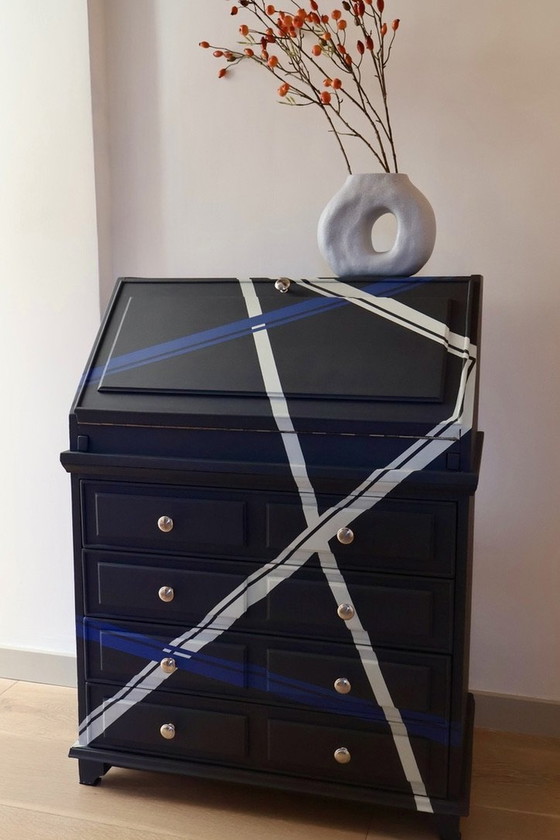 Neu lackiert mit schwarzer Kreidefarbe und künstlerischen hellgrünen und blauen Linien. Die neuen silbernen Griffe sorgen für einen modernen Touch, während die matte Lackierung Haltbarkeit und Schutz gewährleistet. Die Schubladen sind mit einem schwarz-weißen Linienmuster versehen, wodurch das Design sowohl innen als auch außen einheitlich und stilvoll bleibt. Vielseitig und funktionell: ✔ Schlafzimmer - Als stilvoller Schreibtisch oder praktische Aufbewahrungslösung ✔ Kinderzimmer - Perfekter Arbeitsbereich mit geräumigen Schubladen ✔ Flur - Ideal für die Aufbewahrung von Schlüsseln, Schals, Handschuhen und anderen wichtigen Dingen Ein einzigartiges, handbemaltes Möbelstück, das mehr als nur ein Sekretär ist - es ist Kunst mit Funktion. 📏 Abmessungen: H 100 cm | B 74 cm | T 43 cm 🚚 Lieferung ab 50 € möglich