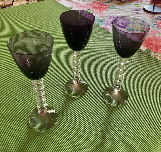 Die Gläser sind vielleicht 2mal verwendet worden und haben keinerlei Makel. Da es handgefertigte Weingläser sind changiert der Farbton etwas - erkennbar vorallem bei den lilafarbenen Gläsern, was aber nur die Individualität unterstreicht. Die Signatur der Firma ist auf dem letzten Photo zu erkennen.