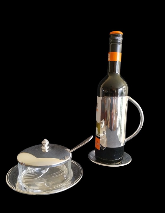 Versilberter Weinflaschenhalter und Bodenschale von Zilverstad Schoonhoven, markiert 90, und eine Hors-d'oeuvre-Schale von Wilkens Germany, beide vermutlich aus den 1980er Jahren. Zilverstad wurde 1875 als eine von vielen Silberfabriken in Schoonhoven gegründet und gehört seit 2009 zur Bredemeijer-Gruppe. Der Weinflaschenhalter von Zilverstad Schoonhoven klemmt sich um die Weinflasche, so dass man den Wein einschenken kann, während man den Griff festhält. Die Weinflasche mit Halter steht auf einer verzierten Bodenschale. Der gläserne Vorspeisenteller von Wilkens Germany steht auf einem versilberten Unterteller und hat einen versilberten Deckel. Der Weinflaschenhalter ist 12 cm hoch. Der Hors-d'oeuvre-Teller hat einen Durchmesser von 11 cm und eine Höhe von 9 cm.