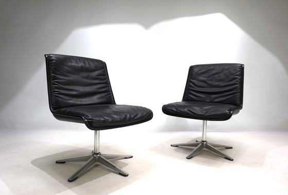 Dieses Set aus zwei Wilkhahn Delta 2000 Stühlen in tiefschwarzem Leder, gebürstetem Aluminium und mit schwarzen Schalen ist in ausgezeichnetem Zustand. Das Leder der Stühle weist kaum Gebrauchsspuren auf, die Keder zeigen minimale Patina. Die Drehfunktion kann über einen Mechanismus im Chromfuß fixiert werden. Die sternförmigen Füße aus gebürstetem Aluminium geben den Stühlen einen festen Stand. Ein Klassiker im Design der 1960er Jahre, der als Büro- oder Esszimmerstuhl verwendet werden kann.