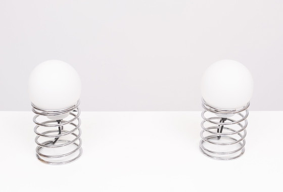 Sehr schönes Paar Chrom Spirale Tischlampen, mit satiniertem Glas Birne geliefert. Sehr guter Zustand. hergestellt von Woja 1970er Jahre kleine Fassung Glühbirnen erforderlich.