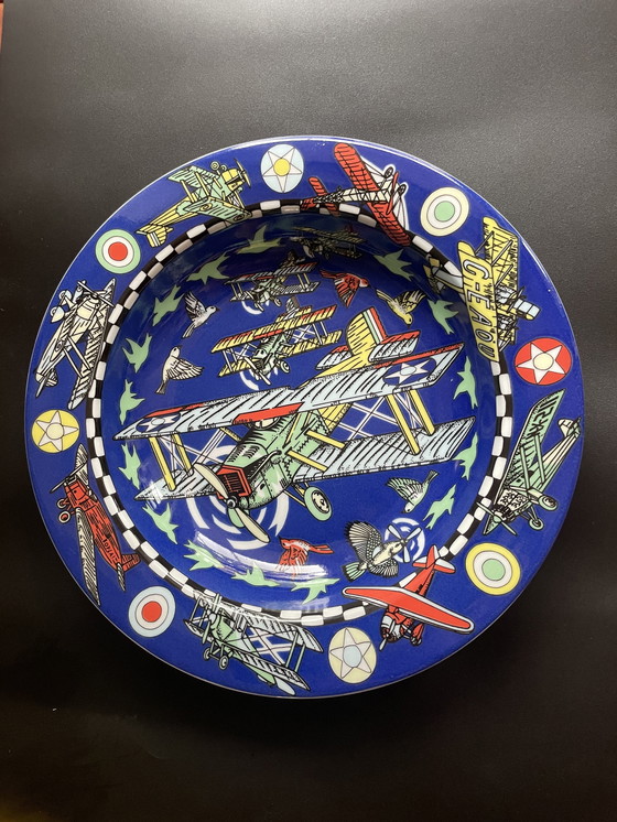 Dieser exquisite tiefe Teller aus der renommierten Bopla-Kollektion ist Teil der Serie „Voyage – World Cruiser“ von Suisse Langenthal. Dieses faszinierende Stück besticht durch sein lebendiges Design mit einer Reihe historischer Flugzeuge, die über einen tiefblauen Himmel schweben, ergänzt durch farbenfrohe Akzente in Rot, Grün und Gelb.