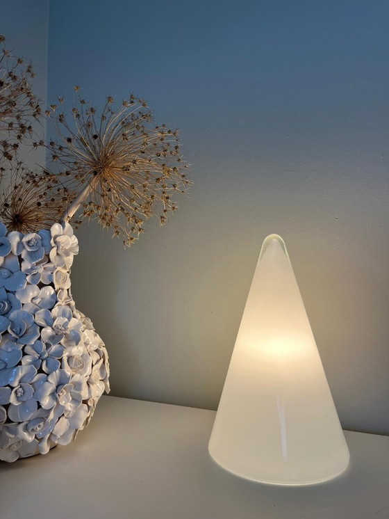 Wunderschöne konische Lampe, komplett aus Opalglas gefertigt. Das Glas wurde in Frankreich hergestellt; es besteht aus mundgeblasenem Klarglas mit weißer Beschichtung auf der Innenseite und transparenter Spitze. Dies ist ein mittelgroßes Exemplar aus der Serie.