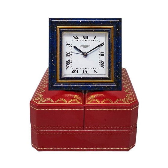 Das Uhrwerk ist aus Lapislazuli und goldfarbenem Metall gefertigt und verfügt über einen Handaufzug. Das Gehäuse trägt die Nummer 7503 07516. Es wird mit dem Originaletui geliefert, das mit rotem Leder ausgekleidet ist, und enthält die Bedienungsanleitung. Der Wecker funktioniert einwandfrei und ist in exzellentem Zustand.
