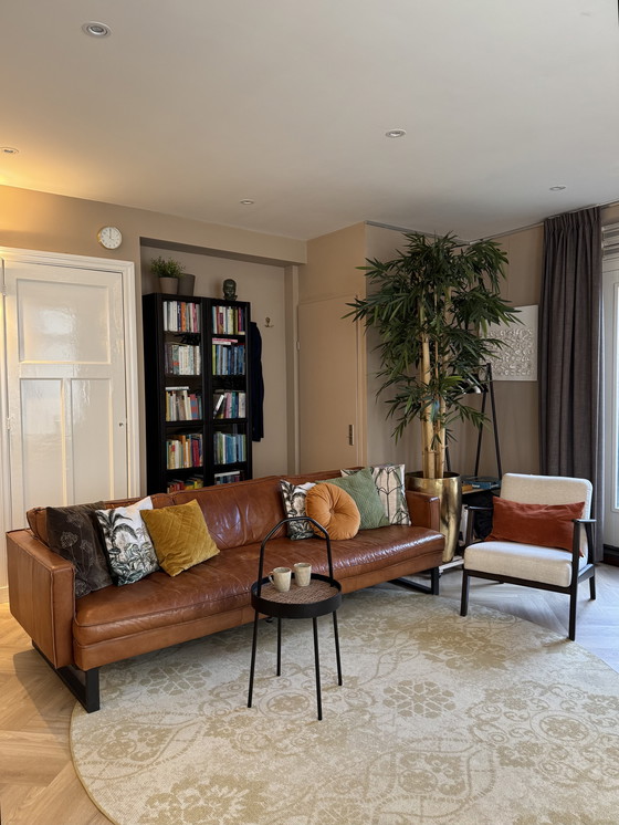 Dieses robuste Ledersofa wurde mit viel Freude genutzt. Es weist einige Kratzer auf der Sitzfläche auf, die jedoch kaum sichtbar sind. Die einteilige Sitzfläche ist ein großer Vorteil; so kann nichts verloren gehen. Cognacfarbenes Leder mit schwarzem Holzgestell. Bequem. Strapazierfähiges Leder. Hält einiges an Abnutzung stand.