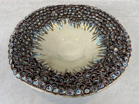 Große Keramikschale mit verspieltem, pilzförmigem Rand und grüner, brauner und blauer Glasur. Gemarkt: Des Pots Holland. In exzellentem Zustand. Durchmesser: 47 cm. Höhe: 13 cm. Gewicht: 6,4 kg.