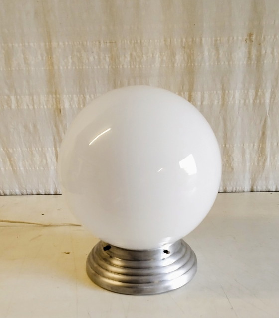 So Déco! Diese Tischleuchte wurde aus einer industriellen Deckenleuchte der 1930er/40er Jahre umgestaltet und besticht durch eine extra große Opalglaskugel (30 cm Durchmesser) und ein Metallgestell. Inklusive B22-Fassung, Kabel, Schalter und Stecker (allesamt normgerecht).