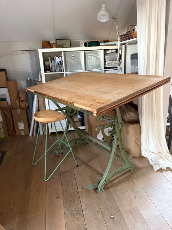 Prächtiger, antiker Architekten-Zeichentisch. Er vereint Funktionalität und Ästhetik. Die Tischplatte ist neigbar. Maße: 100 x 150 cm. Inklusive passendem, neuem Barhocker TIKAMOON. Marke: Tecnic.