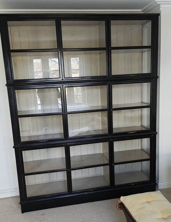 Ein fantastisches Beispiel zeitgenössischen Designs. Dieser imposante Vitrinenschrank, auch Architektenschrank genannt, stammt von den renommierten französischen Designern Roche Bobois. Die schwarz lackierte, kantige Holzkonstruktion lässt sich in drei miteinander verbundene Module unterteilen. Sie öffnet sich mit neun Türen und bietet sechs Ausstellungsfächer.
