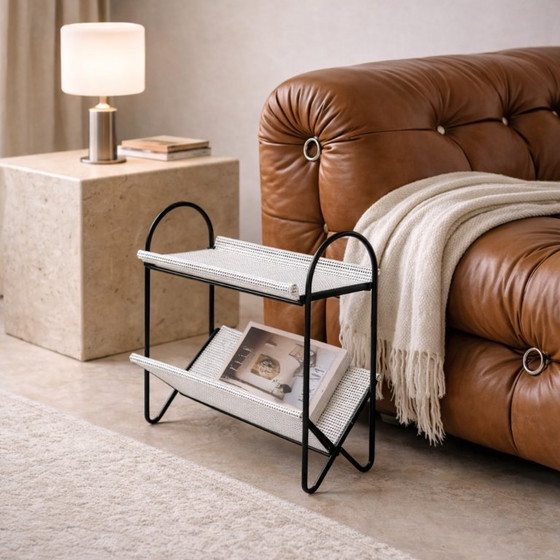 Entdecken Sie die zeitlose Eleganz des Mid-Century-Zeitschriftenständers von Mathieu Matégot für Artimeta. Einleitung: Tauchen Sie ein in die Welt zeitloser Eleganz mit dem Mid-Century-Zeitschriftenständer von Mathieu Matégot für Artimeta, einem französischen Meisterwerk der 1950er-Jahre. Gefertigt aus perforiertem Metall mit geschwungenen Seiten, besticht dieser einzigartige Zeitschriftenständer durch eine raffinierte Ästhetik, die Vintage und Moderne zugleich vereint. Hintergrundinformationen: Mathieu Matégot, ein renommierter französischer Designer, ist bekannt für seine bahnbrechenden Beiträge zur Moderne und seine Fähigkeit, Funktionalität mit künstlerischem Flair zu verbinden. Artimeta, eine führende französische Marke, hat sich durch die Herstellung hochwertiger, stilvoller Möbel, die Generationen überdauern, einen Namen gemacht. Eigenschaften: Dieser formschöne Zeitschriftenständer präsentiert sich in einem zeitlosen Farbschema aus Weiß und Schwarz und fügt sich so mühelos in verschiedenste Einrichtungsstile ein. Mit einer Breite von 62 cm, einer Tiefe von 30 cm und einer Höhe von 60 cm bietet er auf zwei Ebenen ausreichend Platz für Ihre Lieblingszeitschriften und -bücher. Der obere Teil verfügt über ein gerades Regalbrett, während der untere Teil eine einzigartige V-Form aufweist, die für einen dynamischen und interessanten Look sorgt. Styling-Tipp: Das Mid-Century-Zeitschriftenregal von Mathieu Matégot für Artimeta verleiht jedem Raum einen Hauch von Retro-Chic. Platzieren Sie es neben einem bequemen Sessel in Ihrer Leseecke für einen charmanten Vintage-Look oder integrieren Sie es in ein modernes Interieur für einen subtilen Kontrast. Kombinieren Sie es mit anderen Stücken aus derselben Epoche für ein stimmiges und raffiniertes Gesamtbild. Fazit: Entscheiden Sie sich für zeitlose Eleganz und funktionales Design mit dem Mid-Century-Zeitschriftenregal von Mathieu Matégot für Artimeta. Dieses ikonische Stück bringt den klassischen Charme der 1950er-Jahre in Ihr Zuhause und bietet gleichzeitig eine praktische Aufbewahrungsmöglichkeit für Ihre Lieblingslektüre. Verleihen Sie Ihrem Interieur einen Hauch von Vintage-Flair und genießen Sie die zeitlose Schönheit dieses Zeitschriftenregals.