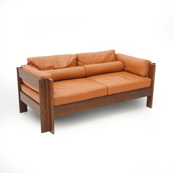 2-sitziges Sofa aus italienischer Produktion, hergestellt von Poltronova in den 1960er Jahren nach einem Entwurf von Sergio Asti. Struktur aus gebogenem Sperrholz und Furnier. Sitz, Rückenlehne und Armlehnen bestehen aus abnehmbaren Lederkissen. Guter Allgemeinzustand, einige Flecken auf dem Leder.