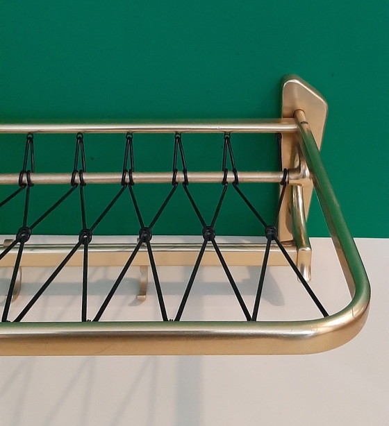 Dieser Vintage-Zug-Garderobenständer aus den 1960er Jahren ist ein großartiges Beispiel für Retro-Design. Sie ist aus robustem Metall gefertigt und hat eine elegante goldene Oberfläche. Die Garderobe verfügt über mehrere Haken und ein Netz für zusätzlichen Stauraum, ideal zum Aufhängen von Mänteln und Aufbewahren von Accessoires. Ein stilvolles und funktionelles Stück, das jedem Raum einen Hauch von Nostalgie verleiht.