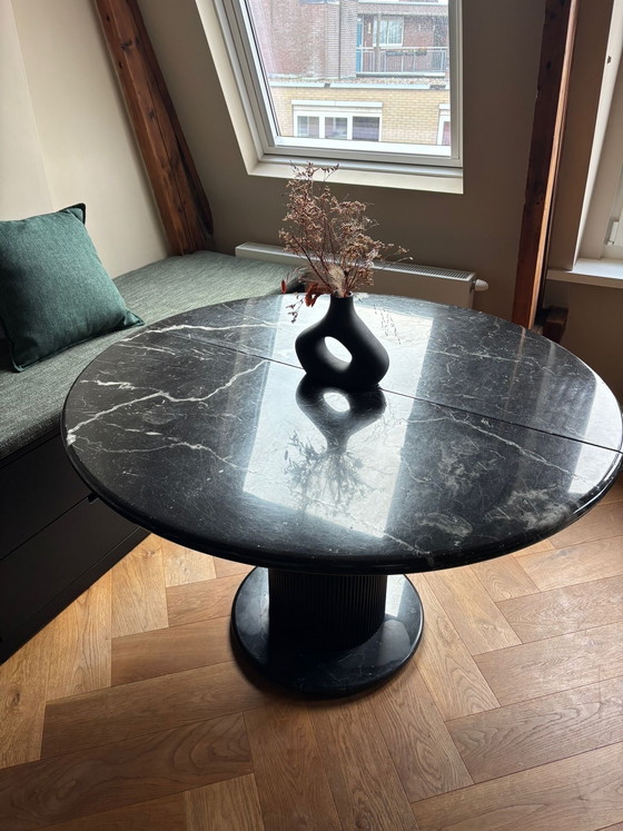 Dieser wunderschöne runde Esstisch ist ein Inbegriff moderner Eleganz. Seine atemberaubende schwarze Marmorplatte mit feinen weißen Adern und das robuste Gestell verleihen ihm einen Hauch von Raffinesse und machen ihn zum perfekten Mittelpunkt jedes Esszimmers. Das schlanke Design und die luxuriösen Materialien sorgen dafür, dass der Tisch ein Blickfang ist und sich gleichzeitig harmonisch in ein modernes Interieur einfügt.