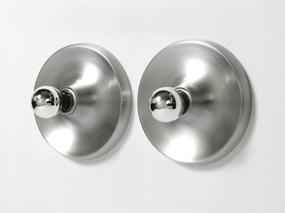 Zwei minimalistische 1960er Jahre Space Age Pop Art Aluminium Decken- oder Wandlampen. Die Vorderseite der Lampen sind mit glänzendem Klarlack überzogen. Voll funktionsfähig, jeweils mit einer E27-Original-Metallfassung. Das Erscheinungsbild ändert sich je nach Größe der gewählten Glühbirne. Sehr schön mit einer verspiegelten Glühbirne. Keine Beulen oder Dellen. Nicht verbogen. Passt zu jedem Einrichtungsstil. Geeignet für alle Wohnbereiche und sehr dekorativ. Funktioniert mit 220V und 110V. Die Verdrahtung ist neu und für alle Länder geeignet. Durchmesser: 22 cm | 8.7" Höhe ohne Birne: 6 cm | 2.4" Höhe mit Birne wie auf den Fotos: 13 cm | 5.1"