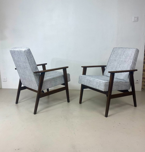 Zwei Sessel des Modells 300-190, entworfen von Henryk Lis. Hergestellt in den 1970er-Jahren in der Möbelfabrik Bystrzyckie. Dank ihrer kompakten Größe eignen sie sich ideal für kleine Räume. Das Holzgestell wurde vollständig restauriert. Die Innenpolsterung wurde durch einen sehr hellgrauen, melierten Stoff ersetzt, wodurch der Stil der 1970er-Jahre erhalten blieb. Die Restaurierung erfolgte mit größter Sorgfalt und unter Berücksichtigung des Originalzustands.