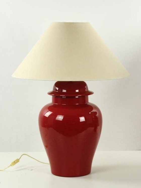 Dieses Set enthält zwei große Tischlampen von Kotska France. Bietet einen schönen roten Akzent für jedes Interieur. Die Lampenschirme sind in hellem Ecru gehalten und bestehen aus einem dicken, knitterfreien Stoff, der für ein elegantes und dennoch warmes Finish sorgt.