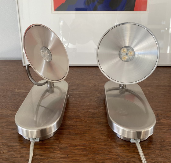 Zwei Philips Wandleuchten im futuristischen Design. Sie eignen sich auch hervorragend als Tischleuchte und beleuchten die Wand. Die Schirme sind drehbar. Die LED-Beleuchtung sorgt für ein angenehmes, warmes Licht. Die Leuchten weisen leichte Gebrauchsspuren auf, die jedoch kaum auffallen. Die Stecker sind nicht geerdet, können aber in Standardsteckdosen verwendet werden.