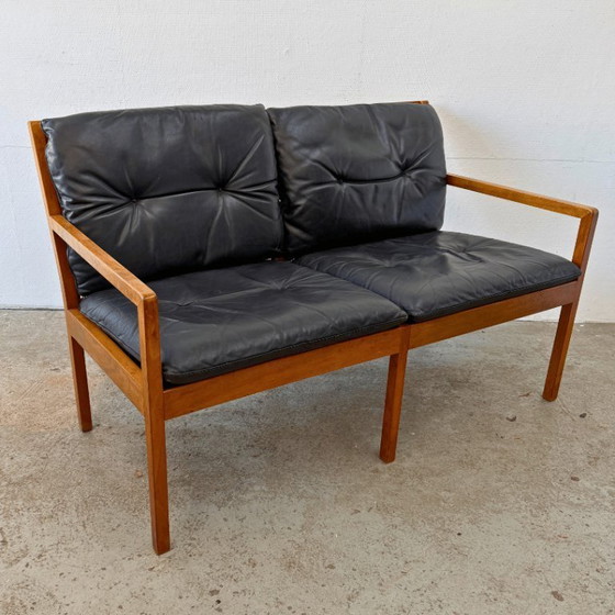 Dieses wunderschöne Zweisitzer-Sofa aus der Mitte des 20. Jahrhunderts ist ein Paradebeispiel für raffinierte Handwerkskunst und unaufdringlichen Luxus. Die Kombination aus dem warmen Holzrahmen, der luftigen Korbgeflecht-Rückenlehne und den eleganten schwarzen Lederkissen verleiht dem Design einen zeitlosen Look, der sich mühelos in Vintage- wie auch in moderne Interieurs einfügt.
