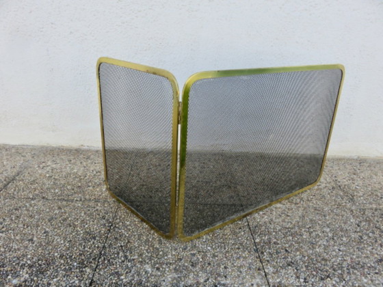 Originaler Kaminschirm aus Messing und Streckmetall, hergestellt in Frankreich in den 1970er Jahren. Maße: geöffnet 100 cm x 45 cm – geschlossen 65 cm x 45 cm. Gewicht: 2,4 kg. Wunderschöne, altersbedingte Patina auf dem vergoldeten Messing. Sehr guter Zustand.