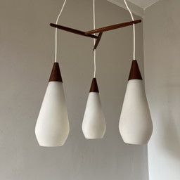 Midcentury Pendelleuchte aus Opalglas und Teakholz, 3 - Arme
