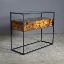 Industrieller Beistelltisch – schwarzes Metall – Glas – HolzschubladenIndustrieller Beistelltisch – schwarzes Metall – Glas – Holzschubladen