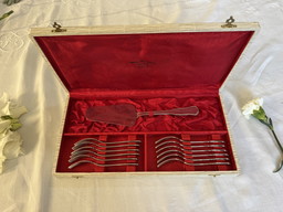 Schachtel mit 12 Edelstahlgabeln und 1 Dessertheber von Devouge Dupont Silberschmiede