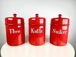 Vintage Red Kitchen Canisters for Tea, Sugar & Coffee  – Dutch Retro Enamel Kitchen Storage Tins – Old European Kitchen Storage Vintage Red Kitchen Canisters for Tea, Sugar & Coffee  – Dutch Retro Enamel Kitchen Storage Tins – Old European Kitchen Storage