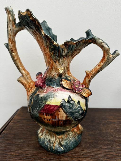 Large Vintage Italian Ceramic Jug - Hand-carved and painted floral decoration - Twisted handle