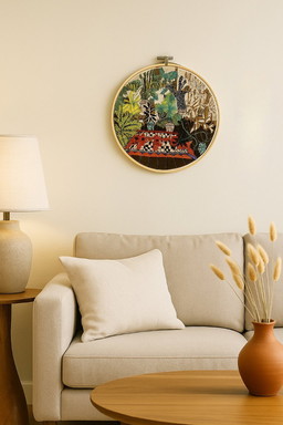 Handmade Botanical Embroidery Hoop Art – 30 cm – Colorful Indoor Plants & Kilim Rug Scene – Wall Hanging Décor