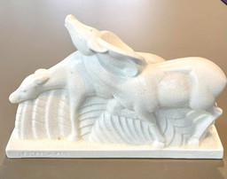 Art Déco bronze sculptures of a shepherd dog and bird on a marble slab. Made in France around 1920.