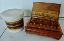 Ceramic tobacco jar by Velasques and a wooden humidor for cigarettes.Ceramic tobacco jar by Velasques and a wooden humidor for cigarettes.