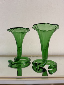 Legras-Montjoye Pair of Green Glass Vases Enameled with Art Nouveau Flowers