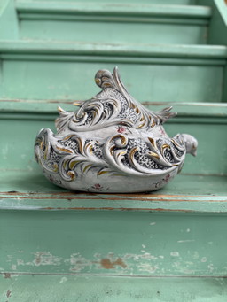 Vintage porcelain jewelry box, hand-painted, with lid, on 4 tall legs, 1950s/60s