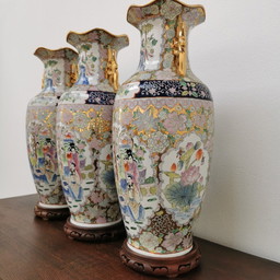 Set of 3 Vintage Oriental Vases Baluster Vases, Canton Porcelain, Porcelain