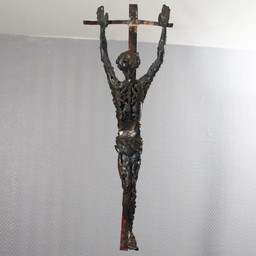 Escultura de crucifixión brutalizada en hierro soldado, bronce y cobre, década de 1970, firmada