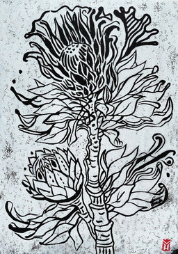 Protea, Impresión linograbada - A3, Tinta blanca sobre papel negro, Arte botánico impreso a mano , Edición limitada