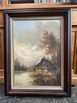 C.Fondanéche-60S Pintura al óleo francesa sobre lienzo-Escena de otoño-Valle fluvial en el bosque-Signo C.Fondanéche-60S