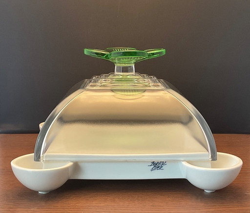 Cabaret decorativo, platos de servir de vidrio prensado sobre una bandeja con espejo, Art Decó