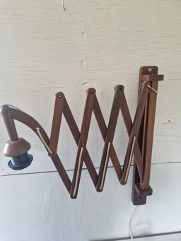 Lámpara de pared vintage con brazo extensible de madera y pantalla cónica de tela