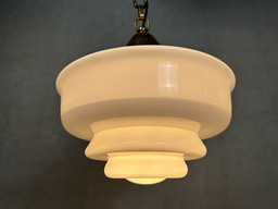 Lámpara colgante Art Déco de cristal opalino, cristal jaspeado marrón y aplique de latón, Bélgica