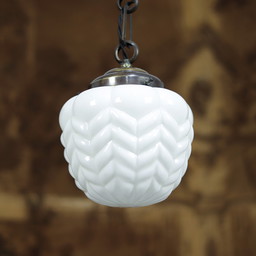 Lámpara colgante vintage estilo Hollywood Regency con globo de cristal moteado blanco.