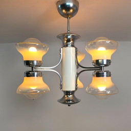 Lámpara de araña vintage Kamenicky Senov, de teca, metal, cromo y cristal, años 60.