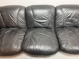 Beautiful Big Black Leather Postmodern Italian Design Space Age 3-Seat Lounge Sofa with Brass Buttons and Playful Cord Lacing