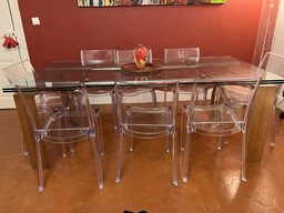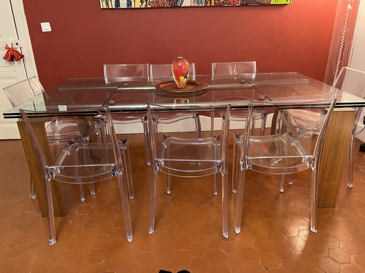 Mesa de comedor extensible de diseño vintage | Vidrio, madera y metal (aprox. 2000)