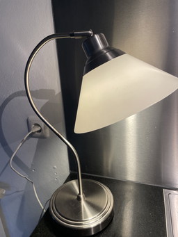 Lámpara de escritorio metálica IKEA – Plata mate – Brazo ajustable – Diseño atemporal