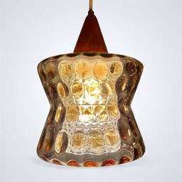 Cozy Mid-Century Scandinavian Pendant in Amber Glass & Teak — Orrefors by Carl Fagerlund, 1960s