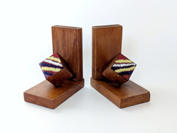 Sujetalibros de madera de mediados de siglo con cubo esmaltado, diseño geométrico modernista, década de 1960.