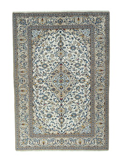 Alfombra oriental Keshan Kork anudada a mano – 360 x 261 cm – Estampado floral clásico en azul y crema